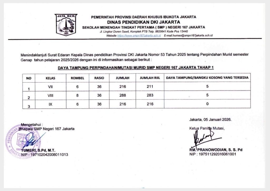 DAYA TAMPUNG MUTASI GENAP TAHUN AJARAN 2025/2026 SMPN 167 JAKARTA Posted on 5 January 20265 January 2026 by OSIS 0 Views:37 views Leave a Reply Cancel replyYour email address will not be published. Required fields are marked *Comment * Name * Email * Website Save my name, email, and website in this browser for the next time I comment. Δ