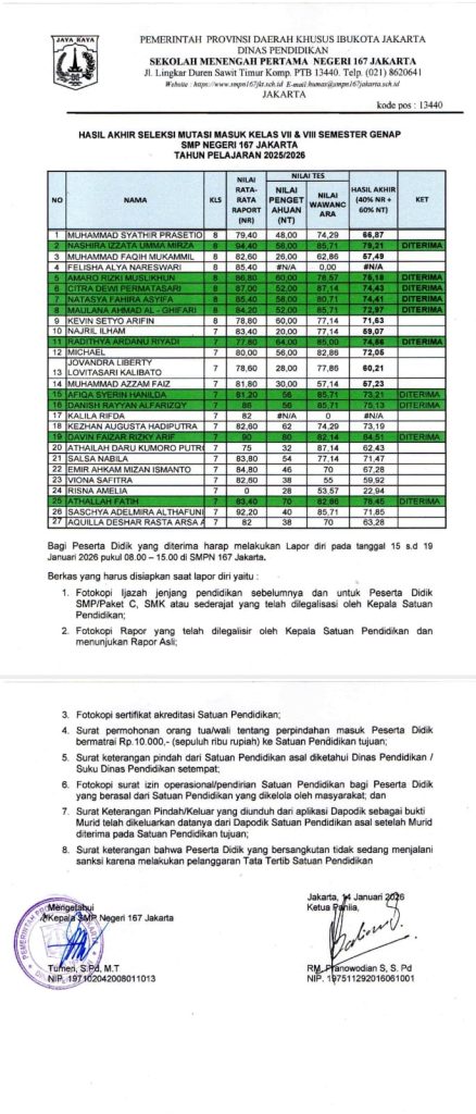 HASIL TES SELEKSI MUTASI SMPN 167 JAKARTA SEMESTER GENAP 2025/2026 Posted on 14 January 202614 January 2026 by OSIS 0 Views:61 views Leave a Reply Cancel replyYour email address will not be published. Required fields are marked *Comment * Name * Email * Website Save my name, email, and website in this browser for the next time I comment. Δ